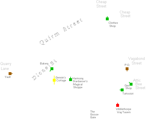 Dione St, Five Ways, GooseGate Rd, Llamendos Way, Nakor St, Pillory Place, Quirm St & Wibblethorpe Way